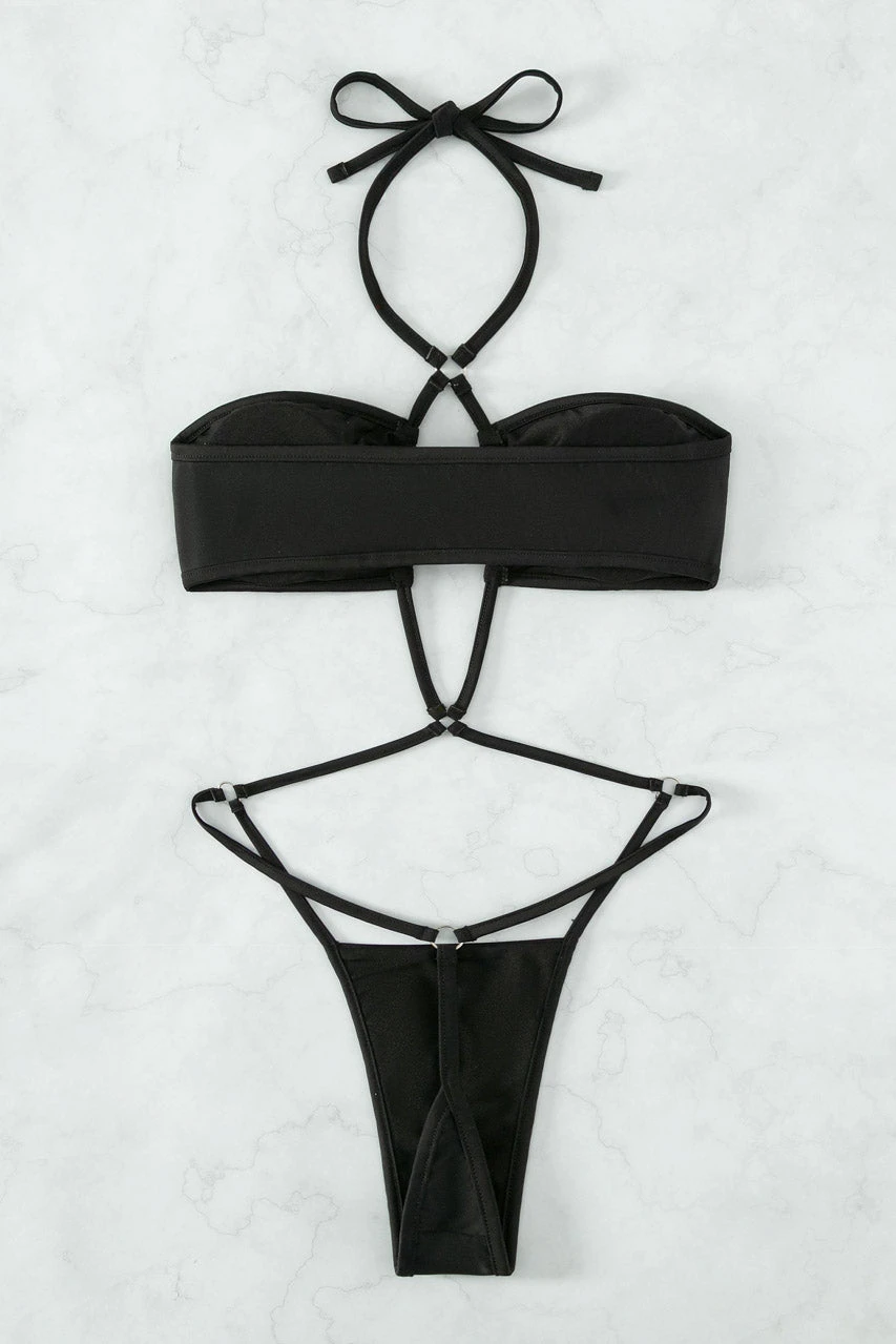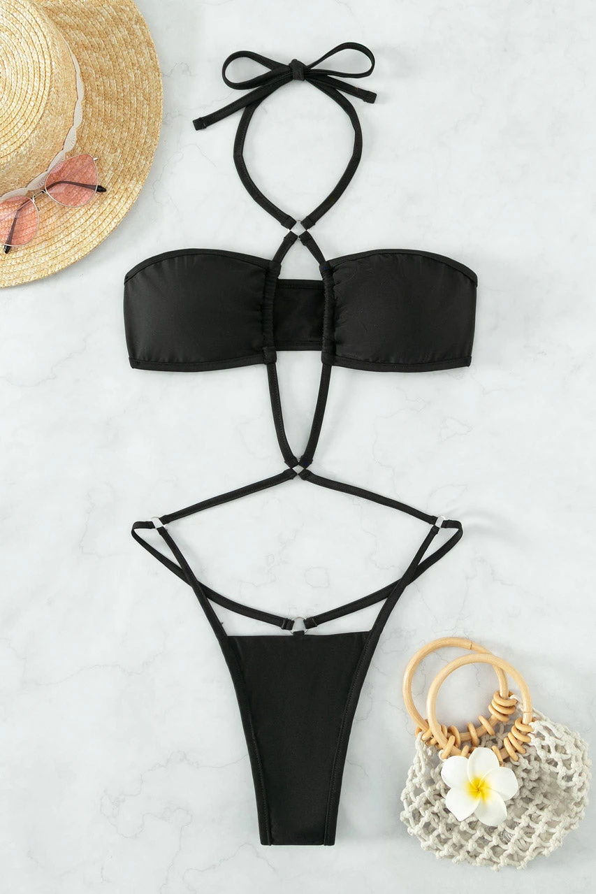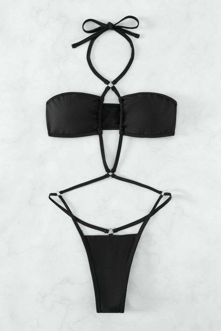 This black micro monokini features a criss cross halter neck, thin strap sides, and a cheeky bottom.