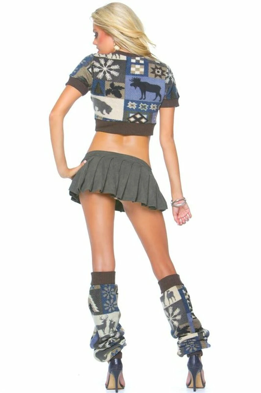 Cold weather got you feeling down? Getting bored staying indoors? Maybe it’s time for some role play to spice things up for both you and your partner. It may be cold outside but things will heat up quickly when you put on this sexy four piece Cabin Cutie Costume. This costume features a gray, pleated, suede-like mini skirt, zip-up crop-top sweater and a pair of matching leg warmers. The sweater and leg warmers are both soft to the touch and feature a rustic cabin print with blues, tans and creams. No one will be complaining of cabin fever and boredom with this fun outfit!
