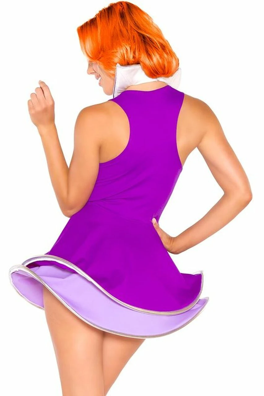 Future fashion is here in this cute and sexy Miss Space Costume! This two piece ensemble includes a bright purple layered hoop mini dress with a lighter purple bottom layer and a white and silver space collar with velcro back closure. This look is perfect for Halloween, theme parties, even sci-fi conventions.