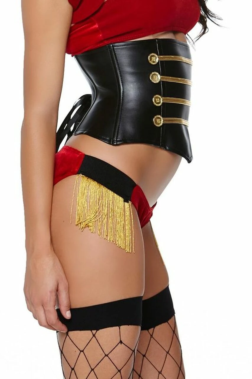 Six Piece Velvet Ringleader Costume for Women includes Tube Top, Shrug with Shoulder Boards, Side Zip Waist Cincher with Lace-up Back, Fringe Detailed Shorts with Removable Garter Belts, Mini Top Hat, and 6″ Leather Whip. Fishnet Thigh High not included. Made in USA