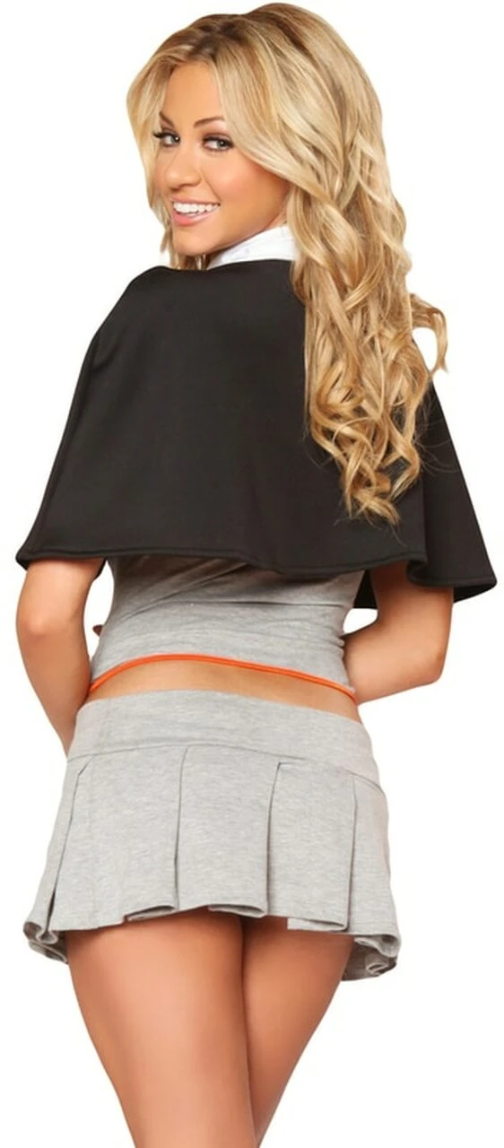 Everyone loves to either see a sexy school girl or be the sexy school girl! This Wizard School Girl costume takes the entire idea to another level! You’ll enjoy having on the short, sexy skirt that will show off your long exquisite legs; the wonderful crop top that will allow your midriff to be shown giving a little tease to what you have to offer, showing the amazingly wonderful bra that comes along with it. It all gets topped off with the black cape that has a button in the front, letting everyone know you’re a wizard along with the wand that can lead to a lot of fun things. Wear this on a fun night out or a fun night in… anywhere you go in this you’ll be turning heads for sure.