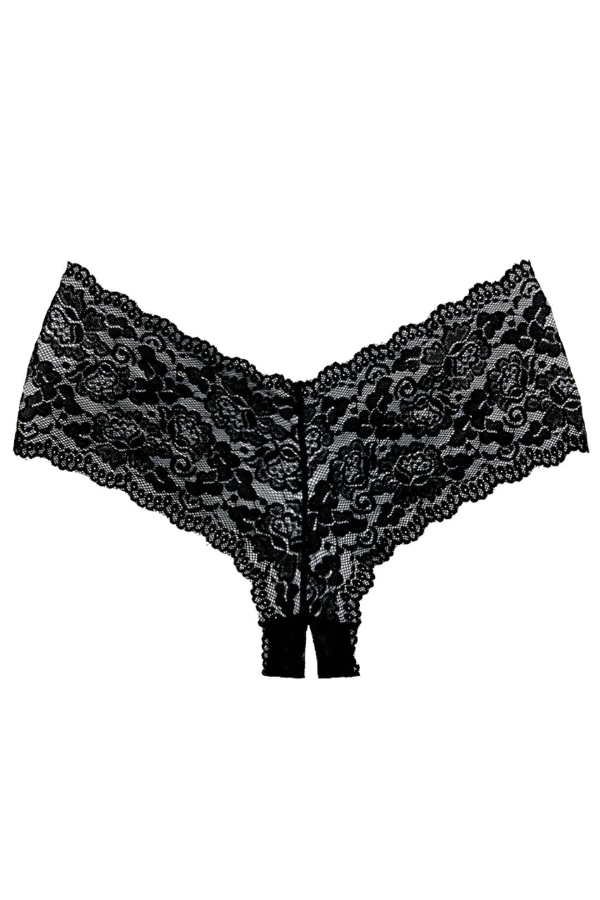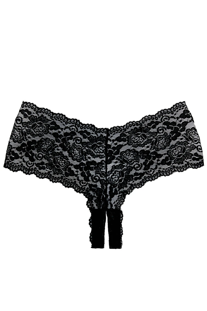 This Apple Cheeks Black Crotchless Boyshort Panty is a classic lace booty short gone wilde with a crotchless twist, hugging the hips and sweetening the derriere.