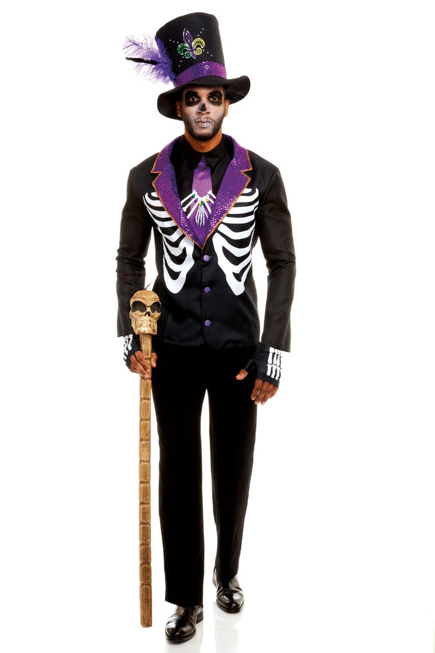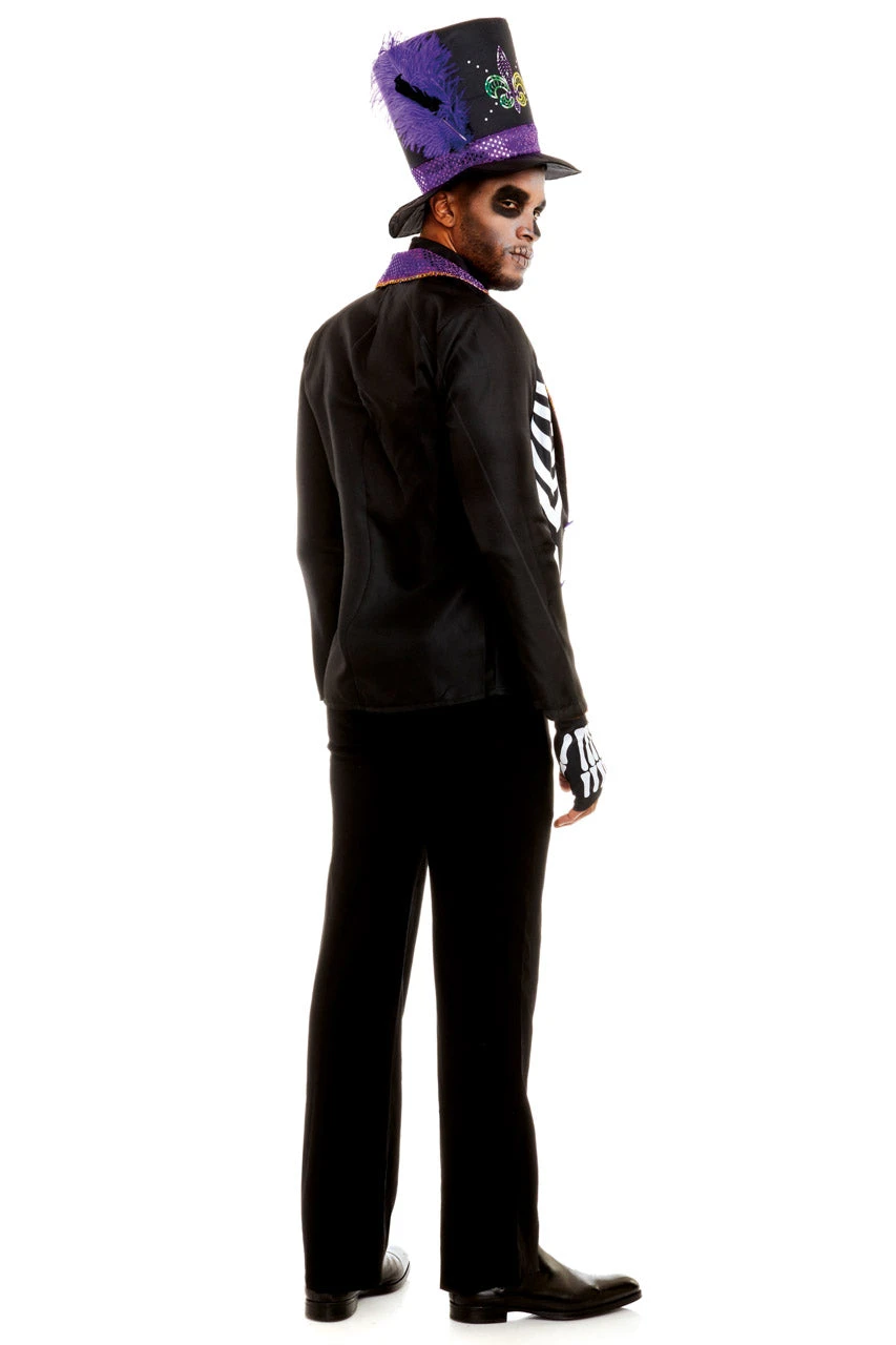 This men’s Bourbon Street Voodoo costume includes a a collapsible top hat, a skeleton printed jacket with purple lapels, a matching dickie, bone necklace, and skeleton print fingerless gloves. (Pants and cane not included.)
