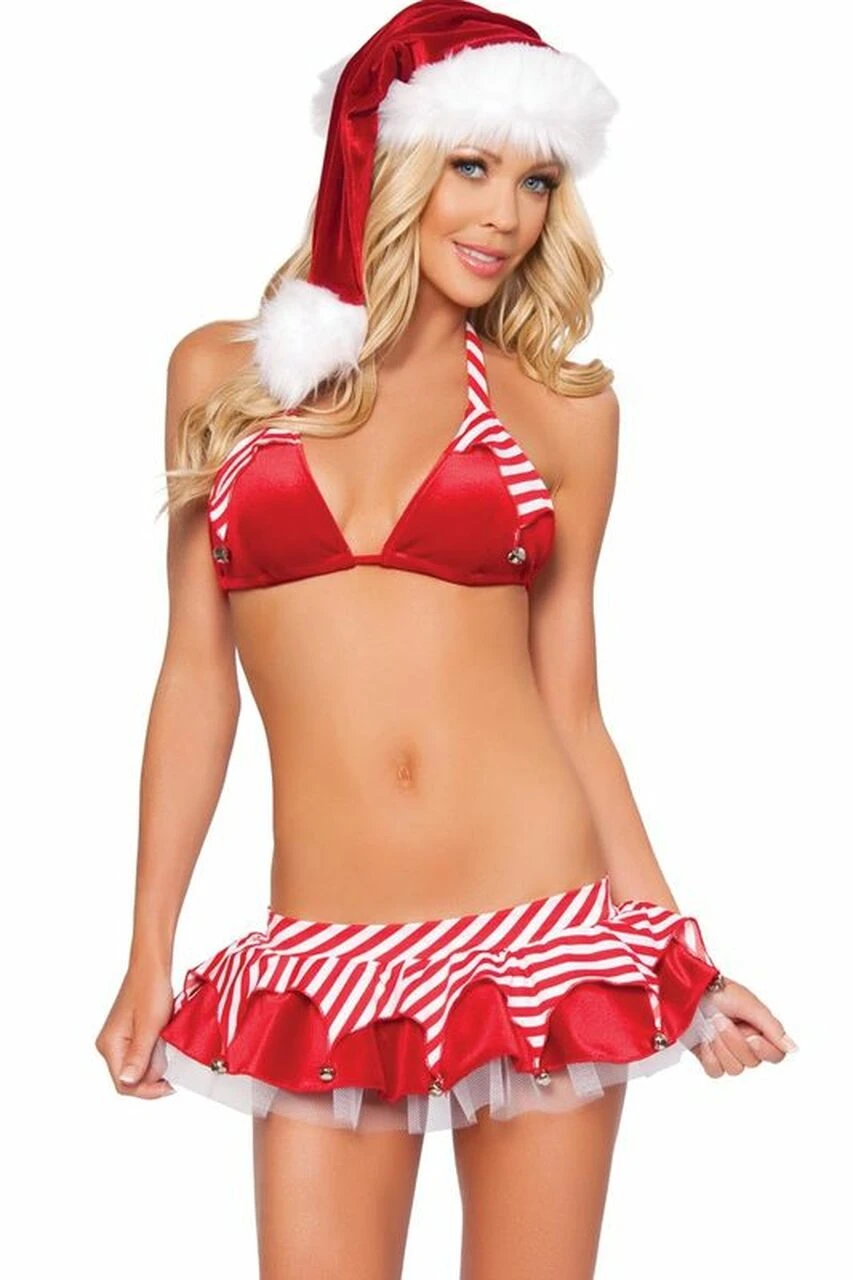 This teeny-tiny outfit consists of a red bra style halter-top, with candy cane fabric along the outer bust that features provocative little jingle bells, and matching micro-mini skirt with built-in layered petticoat and bells.