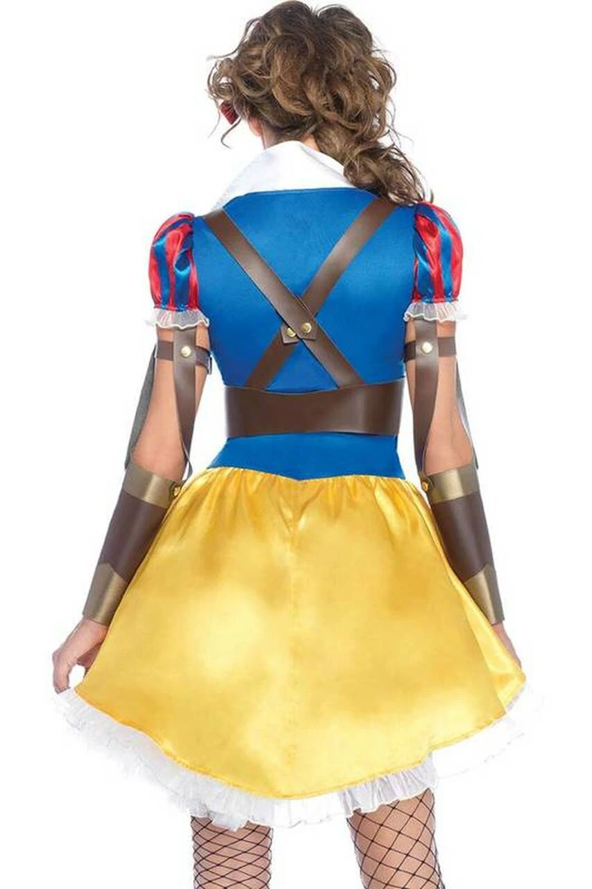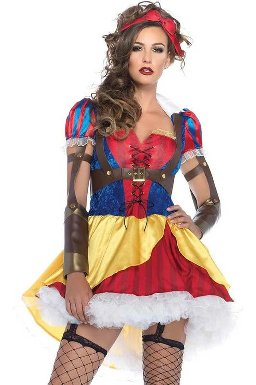 One of the most beloved fairytale characters gets updated with a little attitude with this sexy three-piece costume set. This ensemble features a stunning mini dress with attached faux leather arm cuffs, a high-low hem, and a lace-up bodice to complete the look. It also includes a matching headband with a red bow and body harness to set you apart in the crowd.