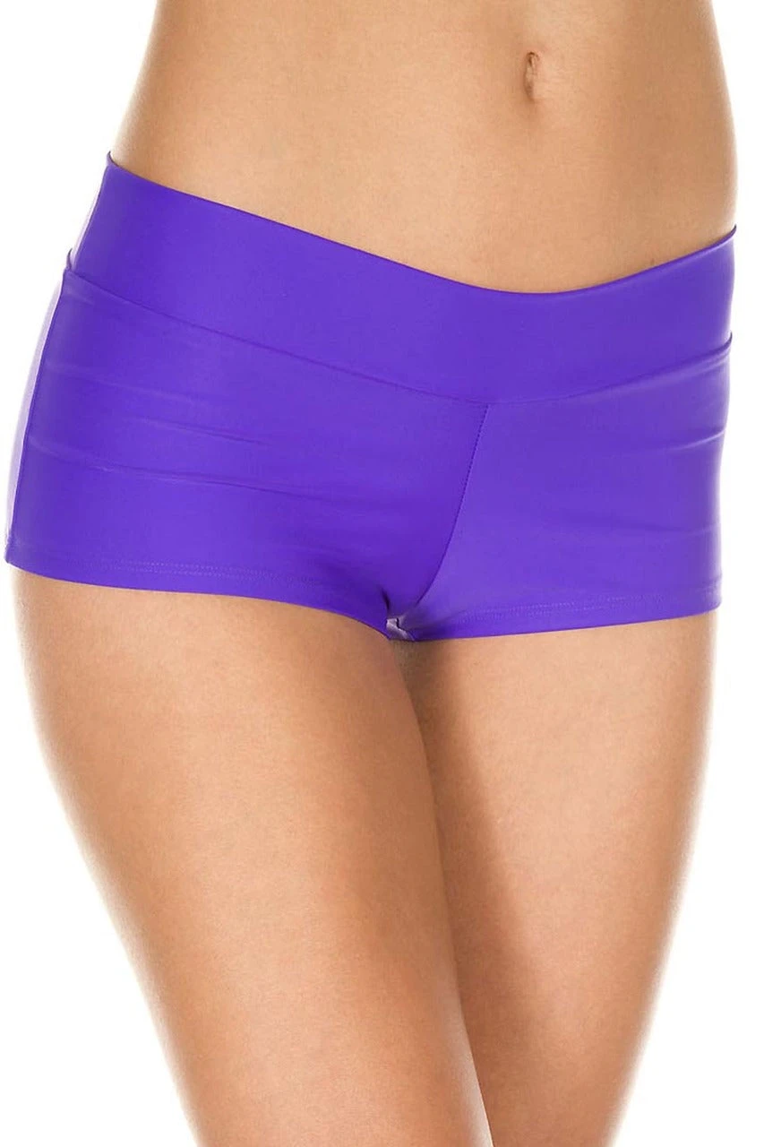 Accessorize your outfit with these Purple Stretch Booty Shorts that include solid color mid-rise shorts with stretch material. Features a hipster style cut in back.