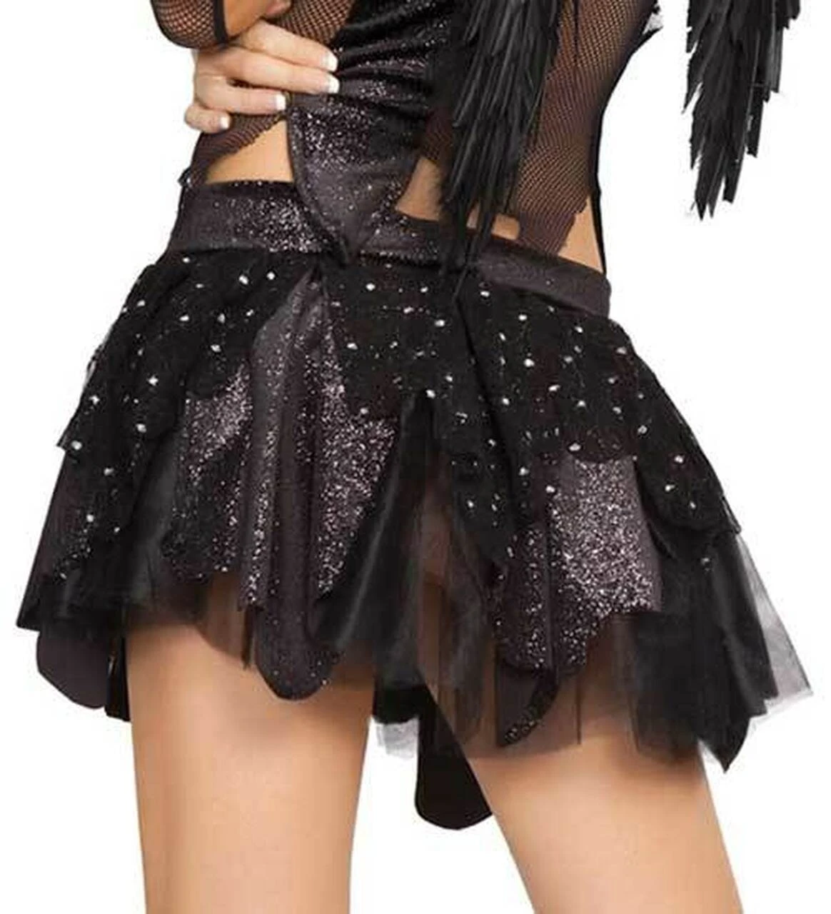 Discover your darkness with this Twilight Raven Black Angel Costume. Show off your curves while leaving some of the mystery to the bedroom with a unique tapered fishnet and fabric top. A short skirt with a tattered hem adds to the sultry appeal, and rounding out the costume is a black and white rose Appliqué that screams Gothic. For an extra dimension to the outfit add one of our chokers or black angel wings.