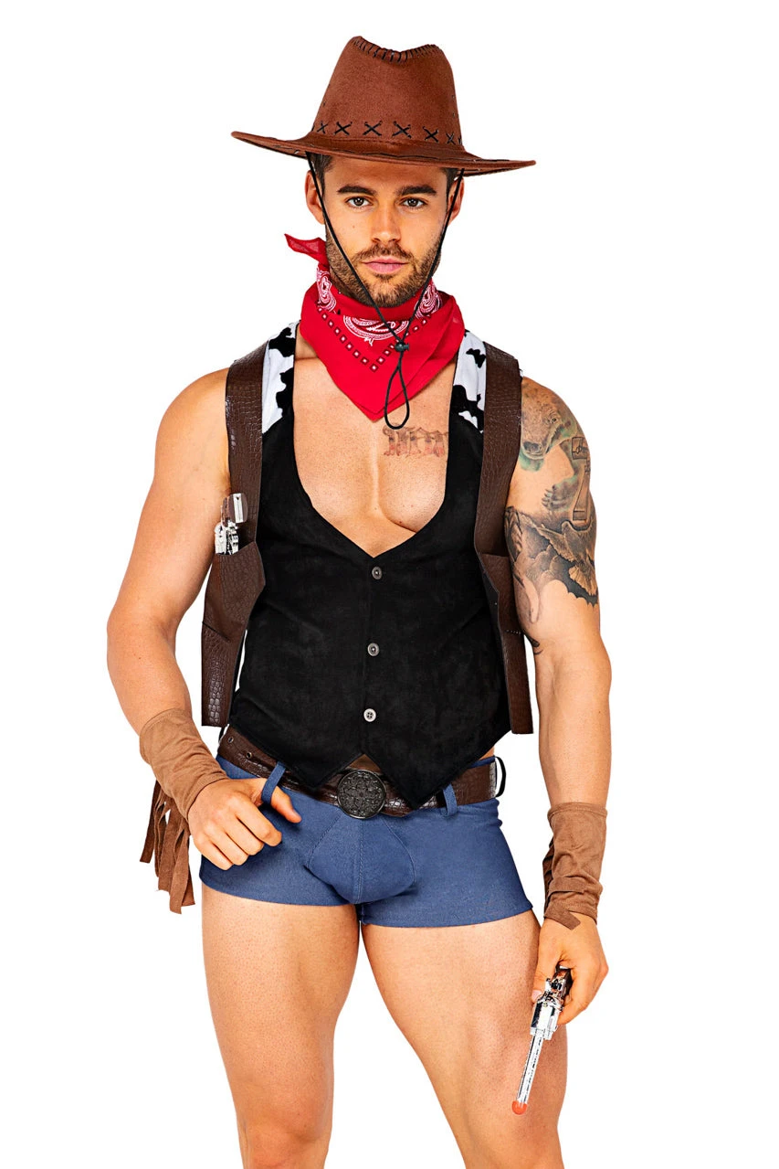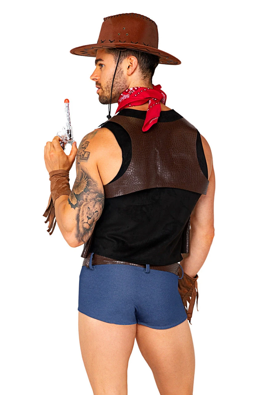 This seven-piece, Showdown Cowboy costume includes a black button front vest, red bandana, faux denim trunks, holster, wrist cuffs, belt, and hat.